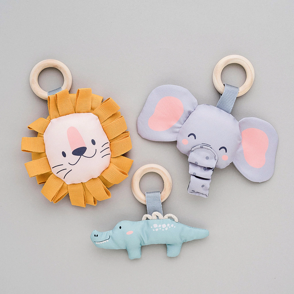 Se cuelgan en el gimnasio con tiras de tela con broches metálicos que son ajustables a 2 alturas, las tiras son adaptables a la baranda de la cuna, cochecito, etc... para que pueda llevar su jueguete preferido a todos lados sin perderlo!